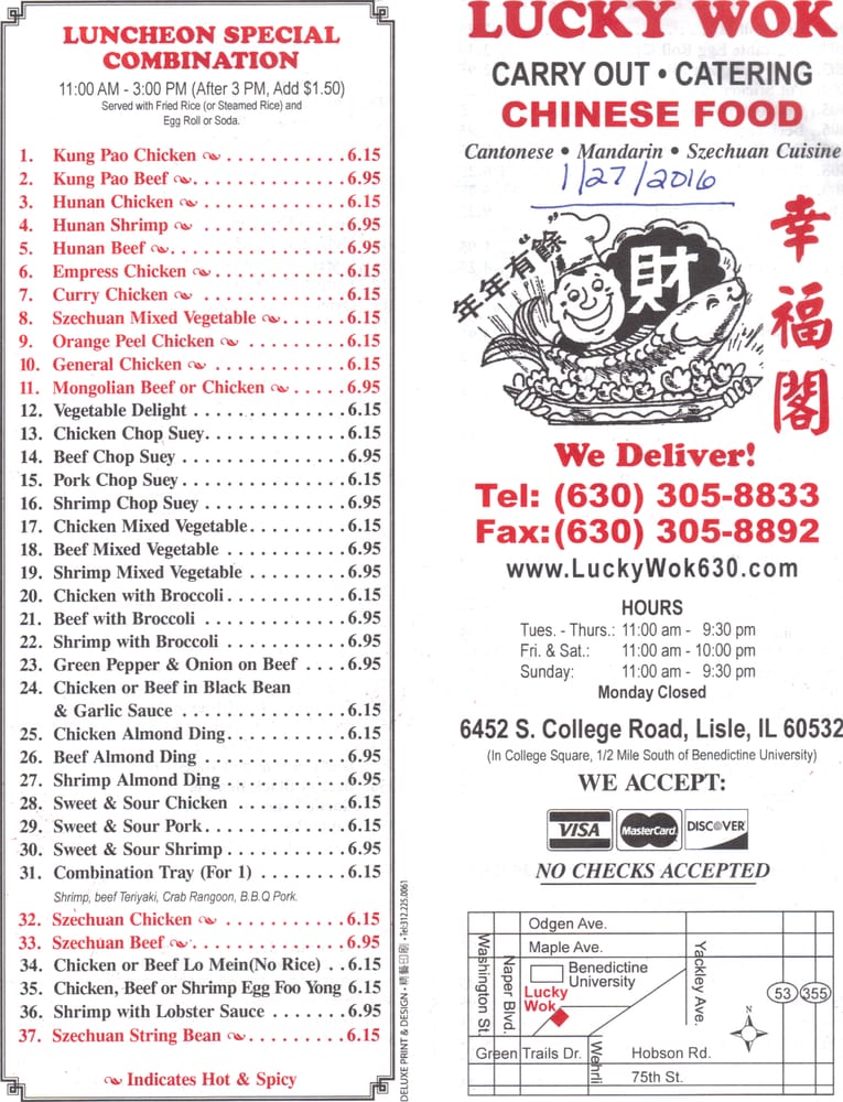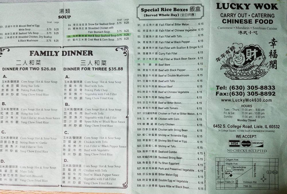 Introducing Lucky Wok Chinese Restaurant, a family-owned gem offering authentic Chinese cuisine in Lisle, IL. Known for their delicious seafood and classic Chinese dishes, Lucky Wok provides a range of options suitable for vegans and vegetarians. With delivery, takeout, and catering services available, this cozy restaurant is perfect for a quiet lunch or dinner. While not wheelchair accessible, Lucky Wok boasts waiter service, Wi-Fi, and even alcohol options. Customers rave about the mouthwatering crab rangoon and suggest adding a soda fountain for convenience. Your taste buds will thank you after a visit to Lucky Wok Chinese Restaurant.