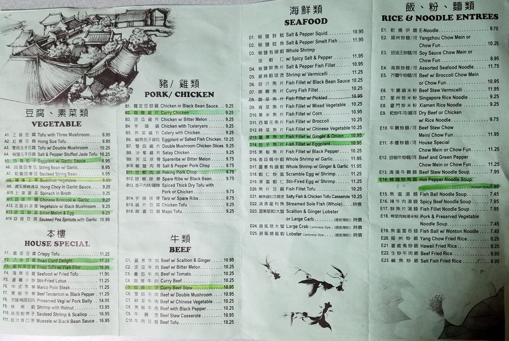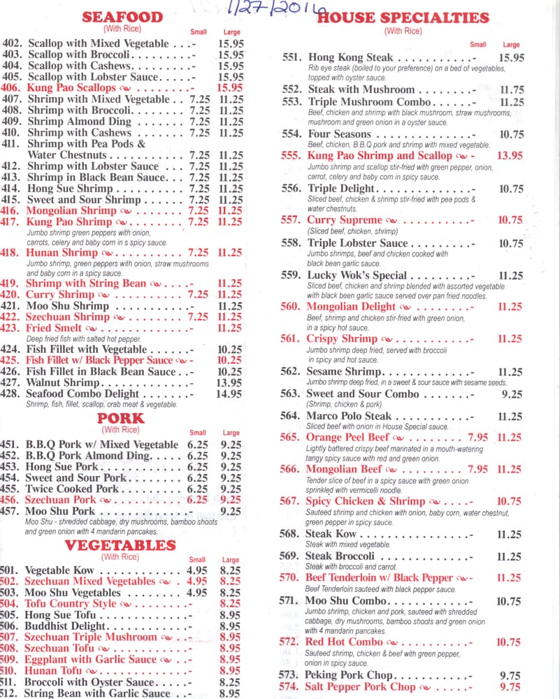 Choice of Corn Soup OR Hot & Sour Soup, Beef with Tofu, Peking Pork Chop, Vegetable with Fish Fillet, and Yang Chow Fried Rice.